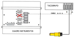 Preparar el cableado del conector A (conector blanco) del tacógrafo según esquema A<->A Cable con el conector blanco del velocímetro. El conector B (conector amarillo) debe estar conectado directamente entre el tacografo y el emisor de impulsos.